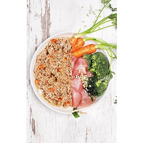 Ekologiczna karma dla psa z samego mięsa mięśniowego kurczaka i dodatkiem selera, bazylii, brokułów i gryki .