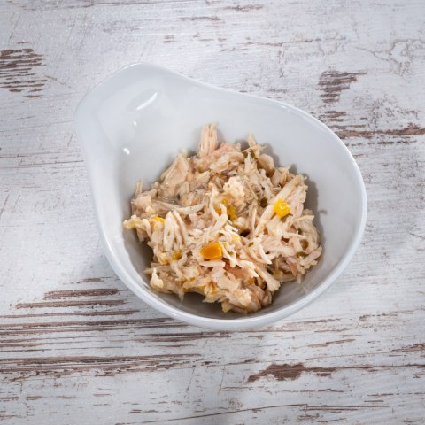 Wykwintne danie z filetu kurczaka i łososia oraz dodatkiem drobno posiekanej dynii i pietruszki, dla uzyskania wyjątkowego doznania smakowego. OPAKOWANIE ZBIORCZE 12 szt.