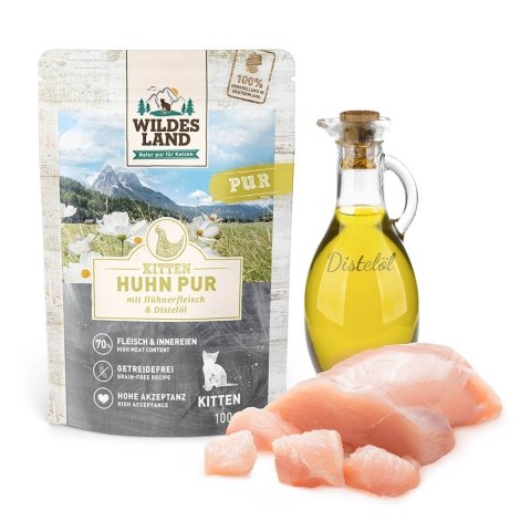 Zapewnij swojemu kociakowi zbilansowaną dietę bogatą w wysokiej jakości białko, aby zdrowo rósł. Karma Wildes Land Cat Pur dla kociąt  zawiera 70% mięsa mięśniowego i cennych podrobów z kurczaka. Jest lekkostrawna, o wysokiej przyswajalności oraz wyjątkowo dobrze tolerowana i lubiana przez kociaki. Naturalnie konserwowana we własnym bulionie, wzbogacona o pyszne podroby - serca i wątróbkę jest wyjątkową ucztą dla Twojego kociaka. Nie zawiera zbóż, jest naturalnie wolna od dodatku sztucznych barwników, aromatów i konserwantów. Przygotowywana z miłością i szacunkiem dla potrzeb gatunkowych kotów.